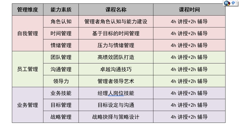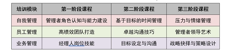 2、課程設置中高層管理者培訓集中在“自我管理”、“員工管理”、“業(yè)務管理”三個維度,每個管理維度都有相對應的能力素質(zhì)模塊,據(jù)此設置針對性課程,具體見表1-3。